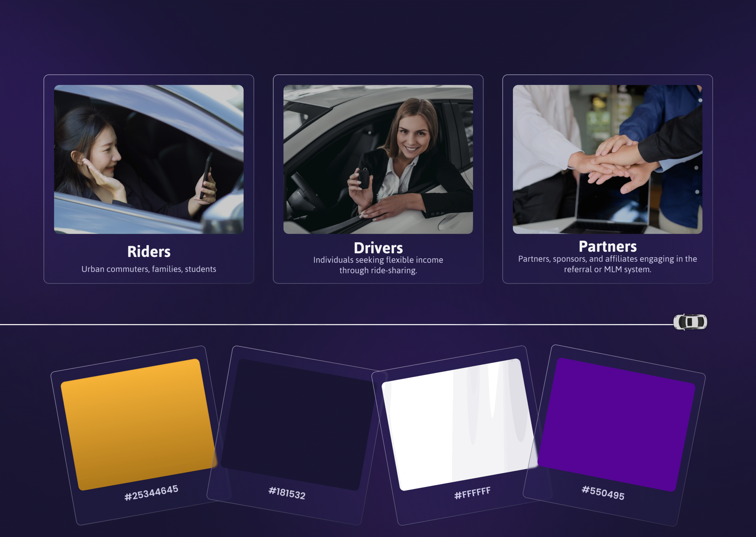We designed a feature-rich, human-centered platform that integrates end-to-end mobile flows, including real-time tracking, digital wallets, loyalty rewards, instant cash-outs, and a multi-level referral system. User research informed intuitive UX and clear onboarding processes for drivers and passengers. A bold, modern visual identity reinforced trust and positioned ALOHA as a connected, premium brand in the ride-hailing space.